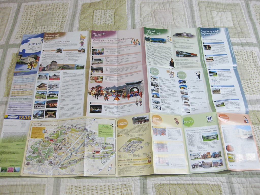 수원에서 관광 센터에서 지도 몇 집어. 수원 어디 나 체재 했다, 송탄와 서울 간의 가장 큰 마을입니다. 거 대 한 역사적인 성곽 및 민속촌 거기 있다. 이 방문 거기에서 그것을 하지 않았다 하지만 내 다음 여행은 확실히 거기 있을 것 이다.첫 번째 지도 수원 및 주변 지역 꽤 좋은 지도가입니다. 또한 지역 관광 사이트에 정보를 많이 있다.